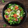 Salade Méditerranéenne Tomates, concombres, olives noires, fromage feta, vinaigrette huile d'olive-citron. |